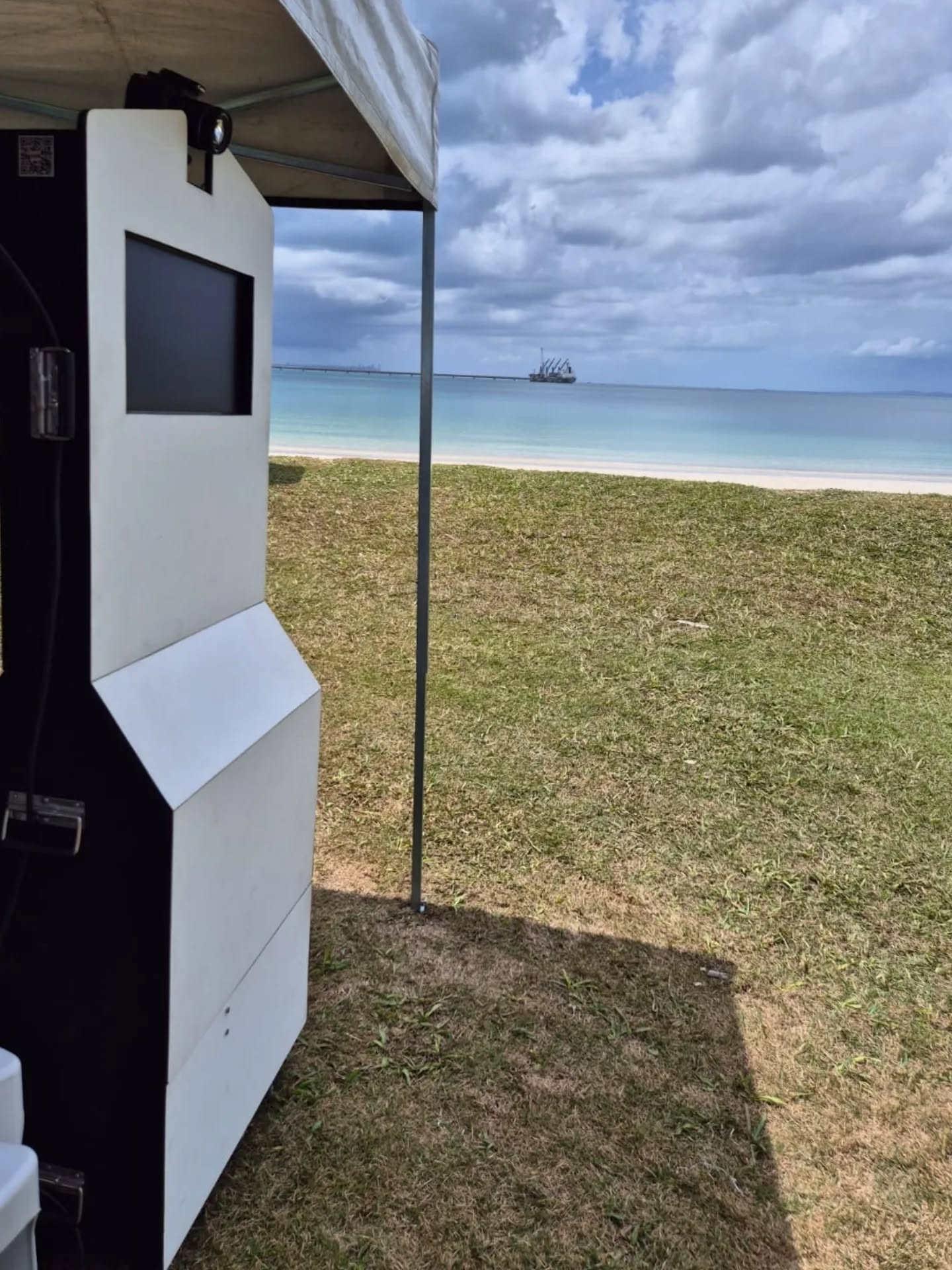 É um equipamento moderno, pequeno e totalmente automatizado, exerce a mesma função da cabine, porém em um espaço muito mais reduzido e dinâmico, a parte frontal também pode ser personalizada para seu evento. Estrutura de 60cm de largura e 170cm de altura, cabe praticamente em todos os lugares.